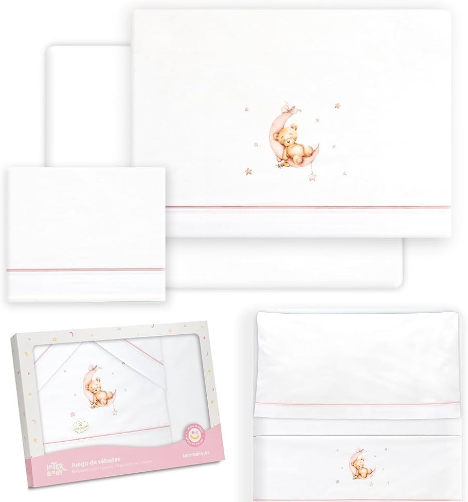 Interbaby – Parure de lit bébé en Coton pour Berceau – Ours Lune étoiles – Ensemble 3 pièces Drap-Housse + Drap Plat + taie d’oreiller