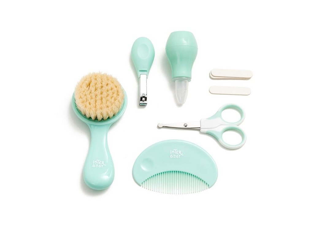 Trousse de de soins (toilette) manucure INTERBABY pour que vous puissiez prendre soin de votre bébé facilement et rapidement. Elle est utile dans le nettoyage quotidien et lors de vos déplacements. Contient – La brosse a des poils très doux et le peigne a des dents arrondies pour que le moment du peignage soit très agréable pour l’enfant. – Un coupe ongles. – Ciseaux à bords arrondis. – Des limes pour éviter les entailles et les rayures. – Un aspirateur nasal pour nettoyer les narines de bébé. Conforme aux normes de sécurité européennes. Produit adapté à une utilisation à partir de 0 mois et plus. Ne contient pas de Bioéthanol (0%). Couleur Rose Gris bleu Vert . Disponible en Algérie sur www.kissa.dz